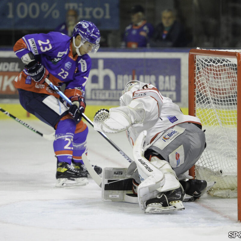 Innsbruck,Oesterreich,13.SEP.19 - Eishockey - EBEL, Erste Bank Eishockey Liga, HC Innsbruck vs EC Dornbirn. Bild zeigt Rasmus Rinne, Tyler Spurgeon. Photo: www.sportpictures.at/Wolfgang Kern