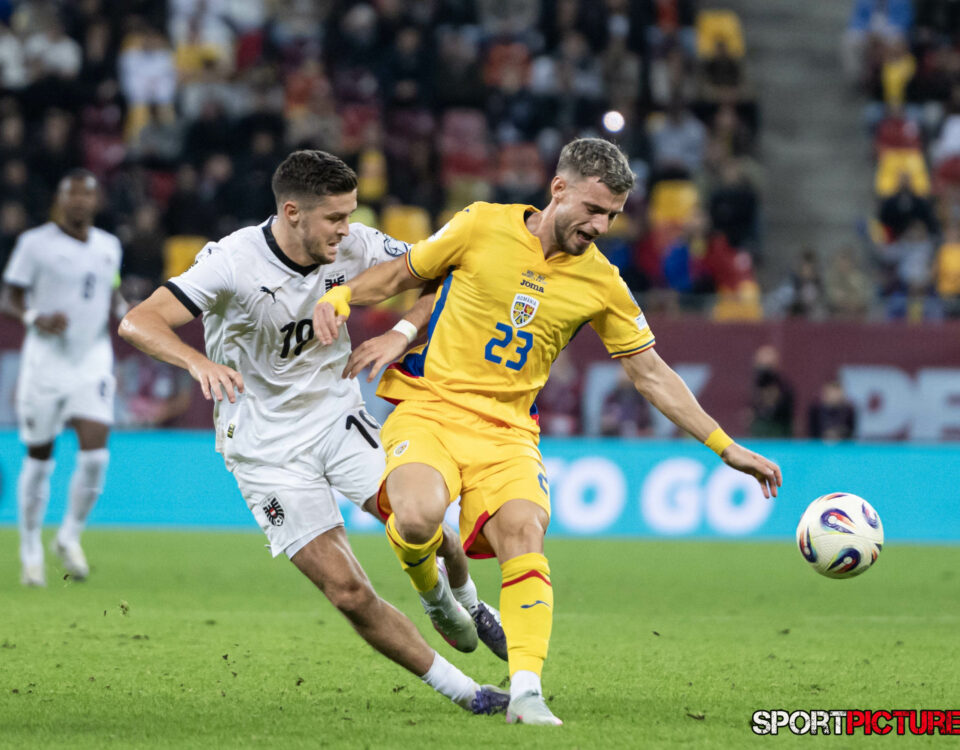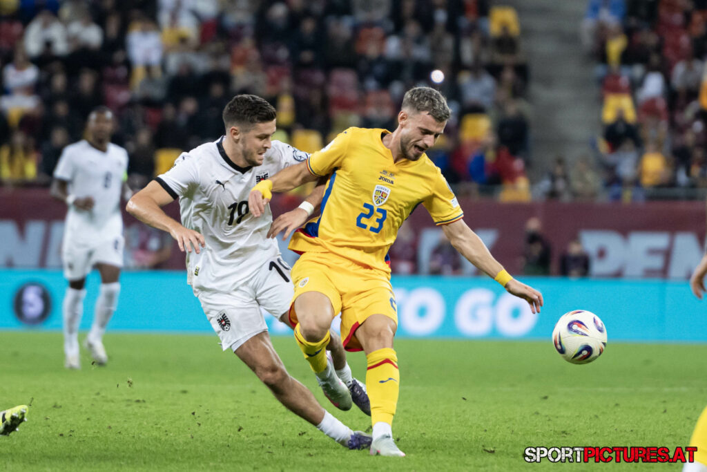 Bukarest,Rumaenien,12.OKT.25 - Fussball -UEFA WM-Quali, Rumaenien - Oesterreich. Bild zeigt Christoph Baumgartner, Vlad Dragomir. Photo: Sportpictures.at/Wolfgang Kern